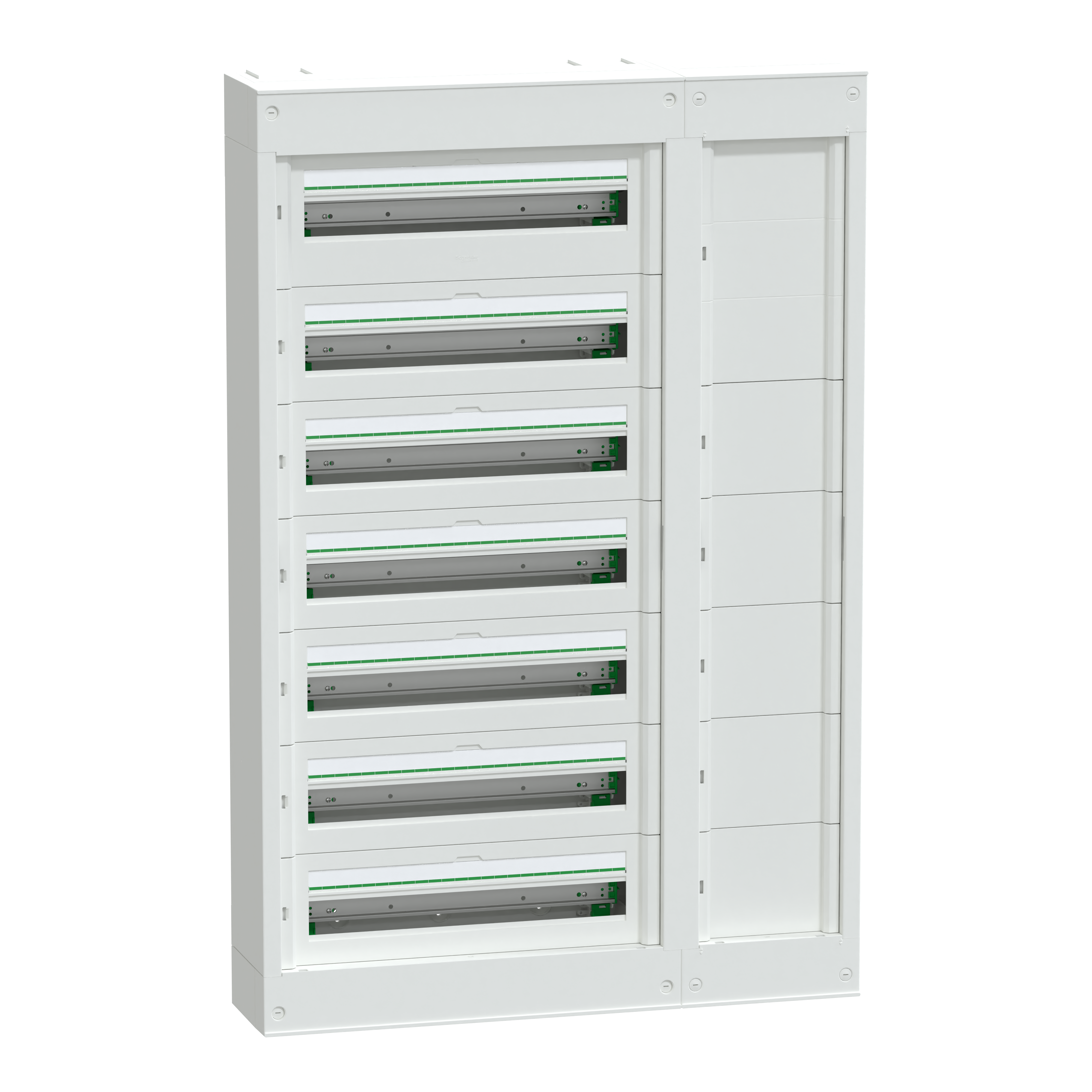 O PrismaSeT S é um quadro de distribuição de baixa tensão saliente de 168 módulos, com um organizador de cabos lateral à esquerda ou direita Este quadro de metal e plástico é composto por 6 filas de 24 módulos de 18mm Pode acomodar todo o tipo de dispositivos de protecção e controlo modular Dispõe de um espaço maior, na primeira fila, para comportar um disjuntor/interruptor NSXm 160 Equipado com um módulo de proteção diferencial, no caso de ser necessário Destinado à instalação em interiores nos setores residencial e comercial Concebido para electricistas, proporcionando ergonomia e flexibilidade na hora de instalar Os cabos podem entrar pela parte superior ou inferior do quadro, através de placas de entrada de cabos amovíveis Permite a entrada por cabo, tubo ou calha Apresenta um grau de proteção IP41, IK09 com porta e um grau de proteção IP30, IK08 sem porta Pode-se instalar uma porta opcional A parte frontal do quadro é branca (RAL 9003) Equipado com 6 calhas assimétricas removíveis, que facilitam cablagem e manutenção do quadro Com 1 bloco de terminais, proporciona 72 saídas (9x25mm² + 63x4mm²) Também pode alojar um distribuidor Acti9 VDIS Equipado com 6 protetores de etiquetas, 5 clipes de cabo, 6 placas modulares e 6 placas de obturação Apresenta uma classe de isolamento elétrico II A sua tensão nominal de isolamento Ui é de 400 V, com uma corrente nominal In de 160A Categoria de sobretensão II Compre com as normas IEC 61439-1 e 3 As dimensões são: 820 mm (largura) x 1258 mm (altura) x 191 mm (profundidade), com um peso de 31 360kg O invólucro é feito de metal e a parte frontal é composta por material tecnoplástico A sua resistência a incêndios é de 750°C para a parte frontal