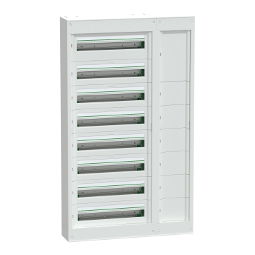 O PrismaSeT S é um quadro de distribuição de baixa tensão saliente de 192 módulos, com um organizador de cabos lateral à esquerda ou direita Este quadro de metal e plástico é composto por 6 filas de 24 módulos de 18mm Pode acomodar todo o tipo de dispositivos de protecção e controlo modular Dispõe de um espaço maior, na primeira fila, para comportar um disjuntor/interruptor NSXm 160 Equipado com um módulo de proteção diferencial, no caso de ser necessário Destinado à instalação em interiores nos setores residencial e comercial Concebido para electricistas, proporcionando ergonomia e flexibilidade na hora de instalar Os cabos podem entrar pela parte superior ou inferior do quadro, através de placas de entrada de cabos amovíveis Permite a entrada por cabo, tubo ou calha Apresenta um grau de proteção IP41, IK09 com porta e um grau de proteção IP30, IK08 sem porta Pode-se instalar uma porta opcional A parte frontal do quadro é branca (RAL 9003) Equipado com 6 calhas assimétricas removíveis, que facilitam cablagem e manutenção do quadro Com 1 bloco de terminais, proporciona 72 saídas (9x25mm² + 63x4mm²) Também pode alojar um distribuidor Acti9 VDIS Equipado com 6 protetores de etiquetas, 5 clipes de cabo, 6 placas modulares e 6 placas de obturação Apresenta uma classe de isolamento elétrico II A sua tensão nominal de isolamento Ui é de 400 V, com uma corrente nominal In de 160A Categoria de sobretensão II Compre com as normas IEC 61439-1 e 3 As dimensões são: 820 mm (largura) x 1408 mm (altura) x 191 mm (profundidade), com um peso de 34 640kg O invólucro é feito de metal e a parte frontal é composta por material tecnoplástico A sua resistência a incêndios é de 750°C para a parte frontal